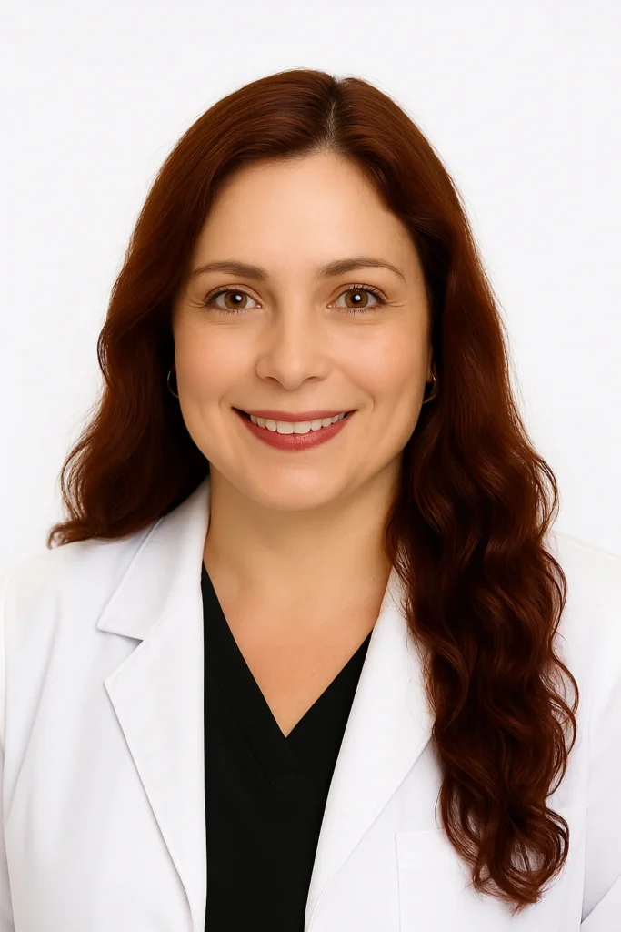 A woman with long, wavy brown hair smiles at the camera. She is wearing a white medical coat over dark scrubs and standing in front of a textured gray wall.